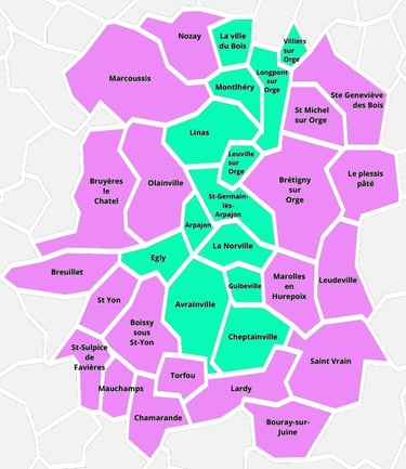 Boissy sous Saint Yon, Bouray-sur-Juine, Brétigny-sur-Orge, Breuillet, Bruyères le Chatel, Chamarande, Lardy, Le PLesis Pâté, Leudeville, Marcoussis, Marolles en Hurepoix, Mauchamps, Nozay, Olainville, Saint Michel sur Orge, Saint Sulpice de Favières, Saint Vrain, Saint-Yon, Sainte Geneviève des Bois, Torfou